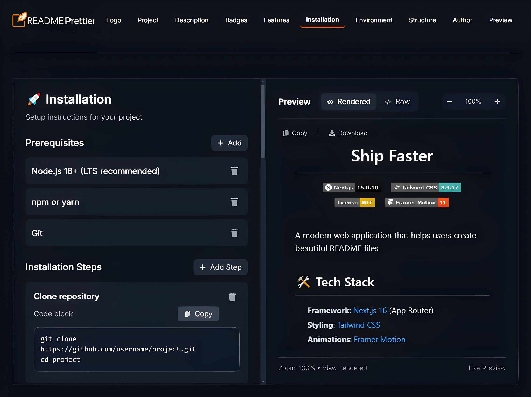 Built a responsive markdown editor using React/Next.js with Tailwind CSS, implementing real-time preview, customizable templates, and one-click export functionality. This is a personal project to help myself and fellow developers craft quick README files that are visually appealing and easy to update.